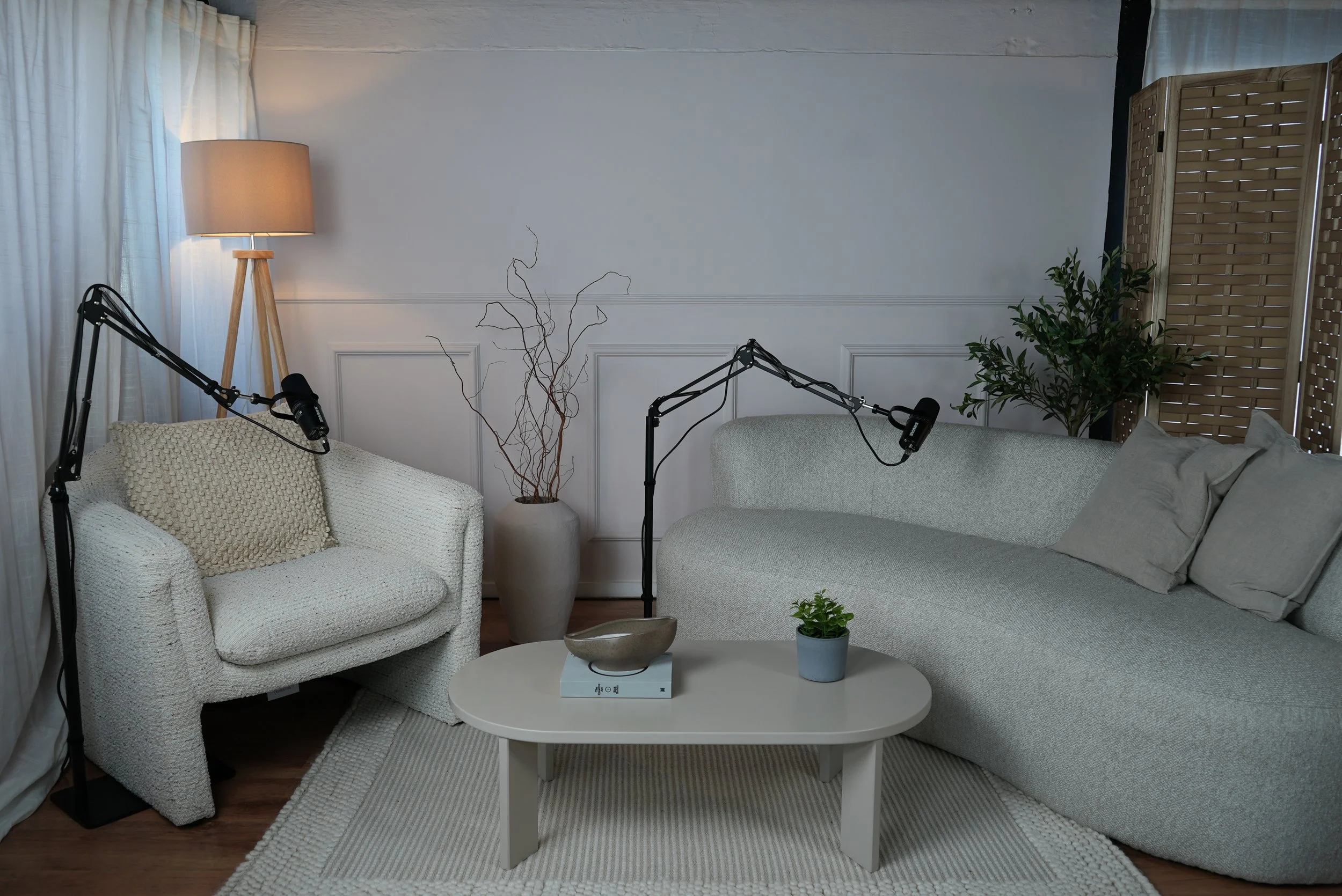 A neutral, living‑room style studio with soft tones, comfortable seating and flattering light, ideal for podcasts, brand content and social video that feels warm and natural on camera.