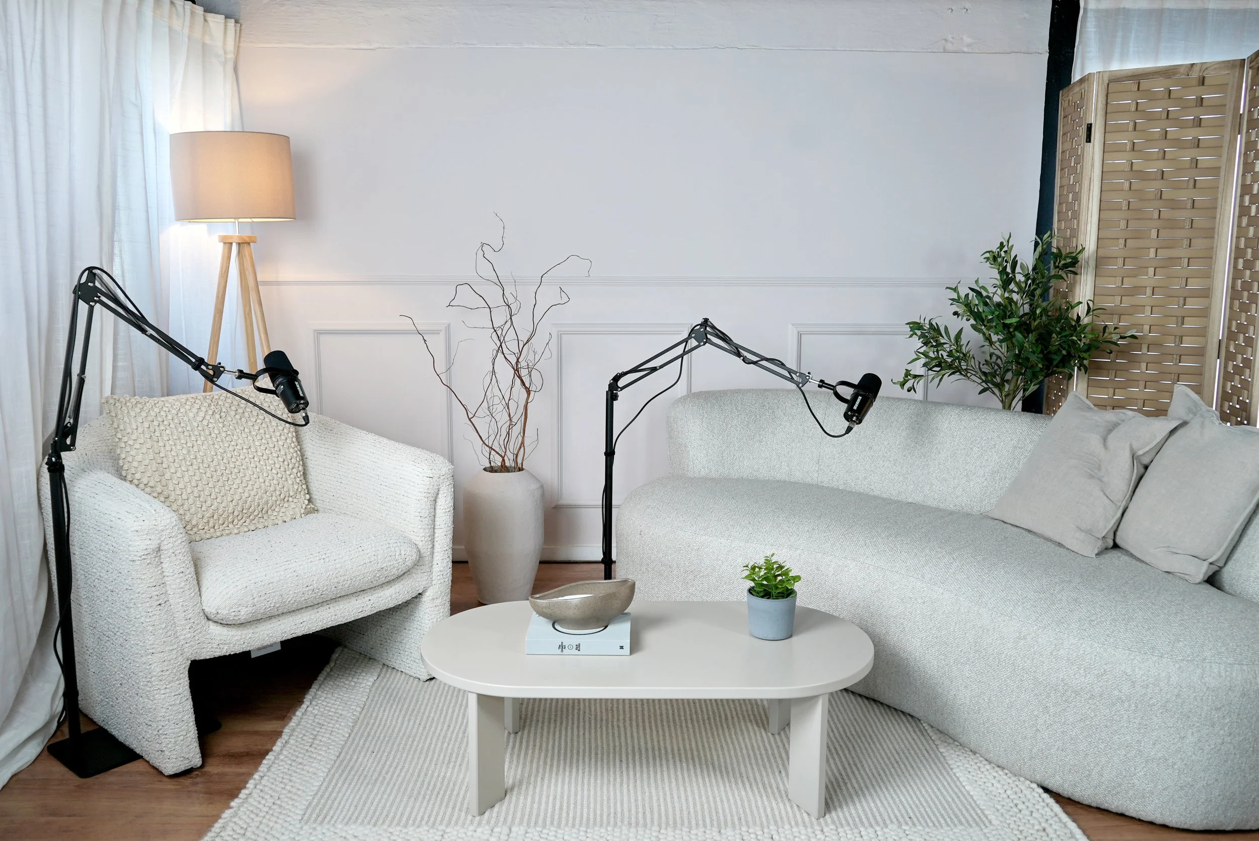 Studio 2 is designed as a lifestyle set with neutral tones and a warm, living-room aesthetic that makes your content feel polished yet approachable. The carefully curated furniture, layout, and lighting are built to flatter on camera, creating a soft, timeless backdrop that works across multiple brands and content styles. The minimal setting keeps the focus on you and your message, while comfortable seating makes it ideal for conversational podcasts, interviews, and direct-to-camera recordings. With flexible styling options including props and plants, you can easily adjust the look to match each project—whether you want something clean and minimal or layered and inviting.